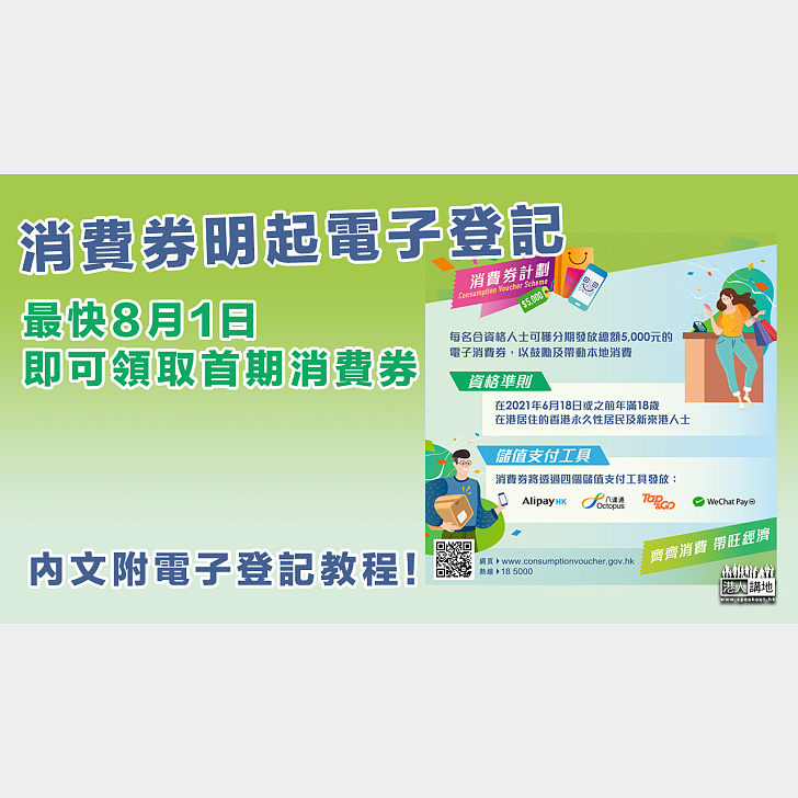 Jul 02, 2021 · 登記政府電子消費券之前,除了上一篇文章所說,有五件事要準備,但更重要的是,你要想清楚會怎樣使用那$5000電子消費券,因為你的背景、想購買的東西金額、是否需要實名等因素,都或者會影響你的決定。而tap&go未必一定是你最好的選擇。另外,有甚麼我們常用的公司,是用不到電子消費券. Jun 28, 2021 · 八達通公司發聲明,澄清網上流傳以八達通領取電子消費券的錯誤資訊。 公司表示,以八達通卡領取第一期消費券時,儲值限額會自動提升至3000元,市民毋須額外去辦理提升儲值限額的手續。市民可以任何八達通卡,包括實體卡、手機八達通卡、配飾、不記名或個人八達通等登記及領取消費券,毋. Jul 04, 2021 · 【now新聞台】5000元消費券今日開始接受登記。 政府設專屬網站登記領取消費券,市民可選擇透過「智方便」應用程式登記。早上七時許,一度顯示有二萬多人排隊,需等候四十多分鐘,若沒有相關應用程式,登記人亦可提供身份證號碼以及回答保安問題,包括早前領取政府派發的一萬元現金的方法. 使用期限:無期限 (但需留意如沒有用盡第一、第二期合共 $4000 消費券,將不獲發第三期 $1000 消費券) 透過 tap & go / alipayhk / wechat pay hk 所領取之消費券 7 月 4 日至 17 日完成的電子登記. Jun 25, 2021 · 透過八達通所領取之消費券. Jun 09, 2021 · 政府將會派發$5000電子消費券,預計下個月就會接受登記,而版主之前都曾經有提到,就表示政府計劃會與八達通、payme等電子支付工具合作,但詳細細節如何,暫時仍待政府公佈。不過,今日八達通公司就向用戶發出了一封電郵,暗示叫你用第二張八達通領取電子消費券。原因是甚麼?看下文吧. Jul 04, 2021 · 財政司司長陳茂波早上落區,協助市民登記領取電子消費券。財政司司長陳茂波發表網誌,上載宣傳片介紹整個電子登記流程及步驟,又提醒市民在. Jun 19, 2021 · 【明報專訊】政府昨公布消費券計劃詳情,市民可於下月4日起登記,分期獲發放共5000元消費券,第1期2000元最快8月可領取。財政司長陳茂波表示,聽取民意後,擴大消費券適用範圍至公共交通費,市民亦可同時領取交通補貼。他說因應不同支付工具技術系統的限制,八達通要分3期發放,首兩期各發. Jun 09, 2021 · 為了確保消費券用於支付本地消費,而非透過八達通銀包轉帳至銀行帳戶,八達通推出短暫安排,如果市民登記八達通卡領取消費券,期間該卡不可以「增值」至八達通銀包,直至用完消費券金額為止,建議市民如果需要定期使用八達通卡增值「銀包」,便選用另一張八達通卡領取消費券。 Jun 30, 2021 · $5000 政府電子消費券將會於 7 月 4 日正式接受市民登記,並在 8 月 1 日發放第一批 $2,000 消費券。作為協助發放消費券的電子支付營辦商之一,alipayhk 支付寶香港在奧海城設立了「消費券體驗館」,設有多個展區,能夠讓市民認識 alipayhk