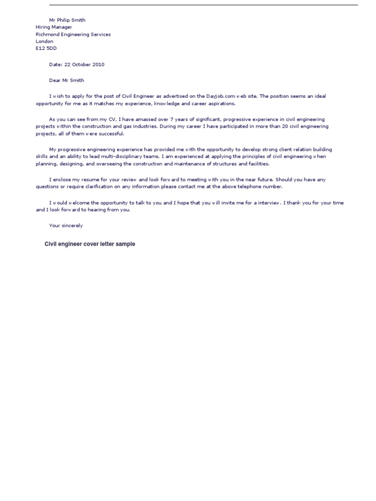 Free Civil Engineer cover letter example 4 from www.dayjob.com Maybe you would like to learn more about one of these? We did not find results for: Check spelling or type a new query. Letter for job application for civil engineer.
